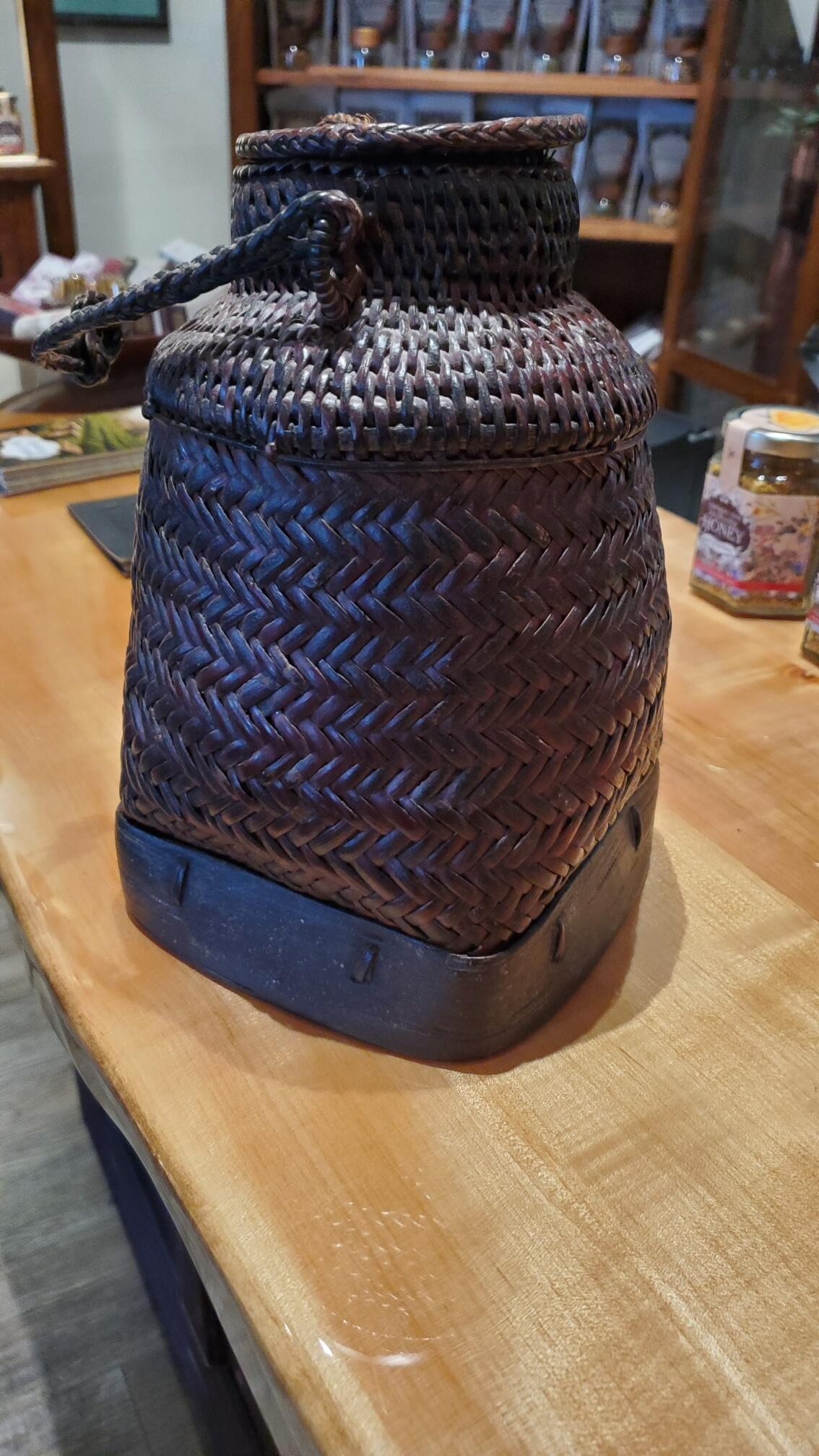 Ifugao Cordillera Hand-Woven Rice Basket with Carved Wood Base (Post-1950s)
