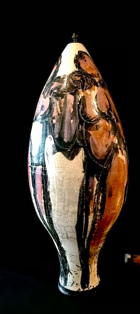 The surface bears the hallmarks of raku: crackled glaze, spontaneous variation, and tactile imperfection—elements that amplify the vessel’s intensity and sculptural integrity. Signed and dated by the artist on the base, this piece is both deeply personal and dramatically universal.