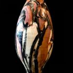 This commanding, raku-fired earthenware vessel by Mark Chatterley stands as both sculpture and statement. Towering and tapering, its surface is hand-painted with gestural figures—raw, unapologetic, and emotionally present. Each side reveals a different facet of the female form, rendered in Chatterley’s signature fluid linework and earthy palette.