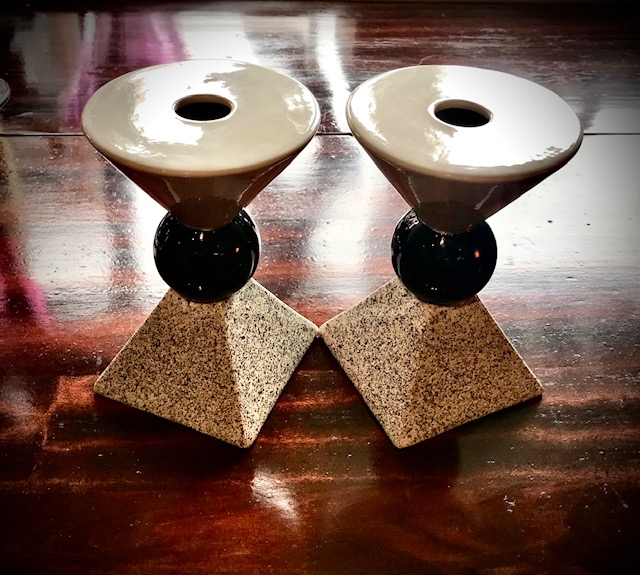 Signed Michael Duvall geometric ceramic candlestick pair