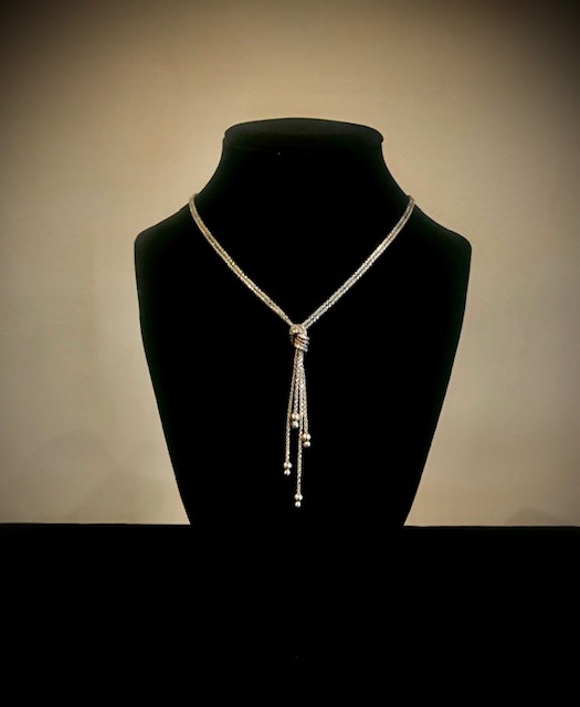 Multiple fine box chains pass through a sliding knot element and finish in bead-tipped tassels. The necklace moves easily on the body and wears close to the neckline, creating an intimate, tactile presence rather than a decorative statement.
